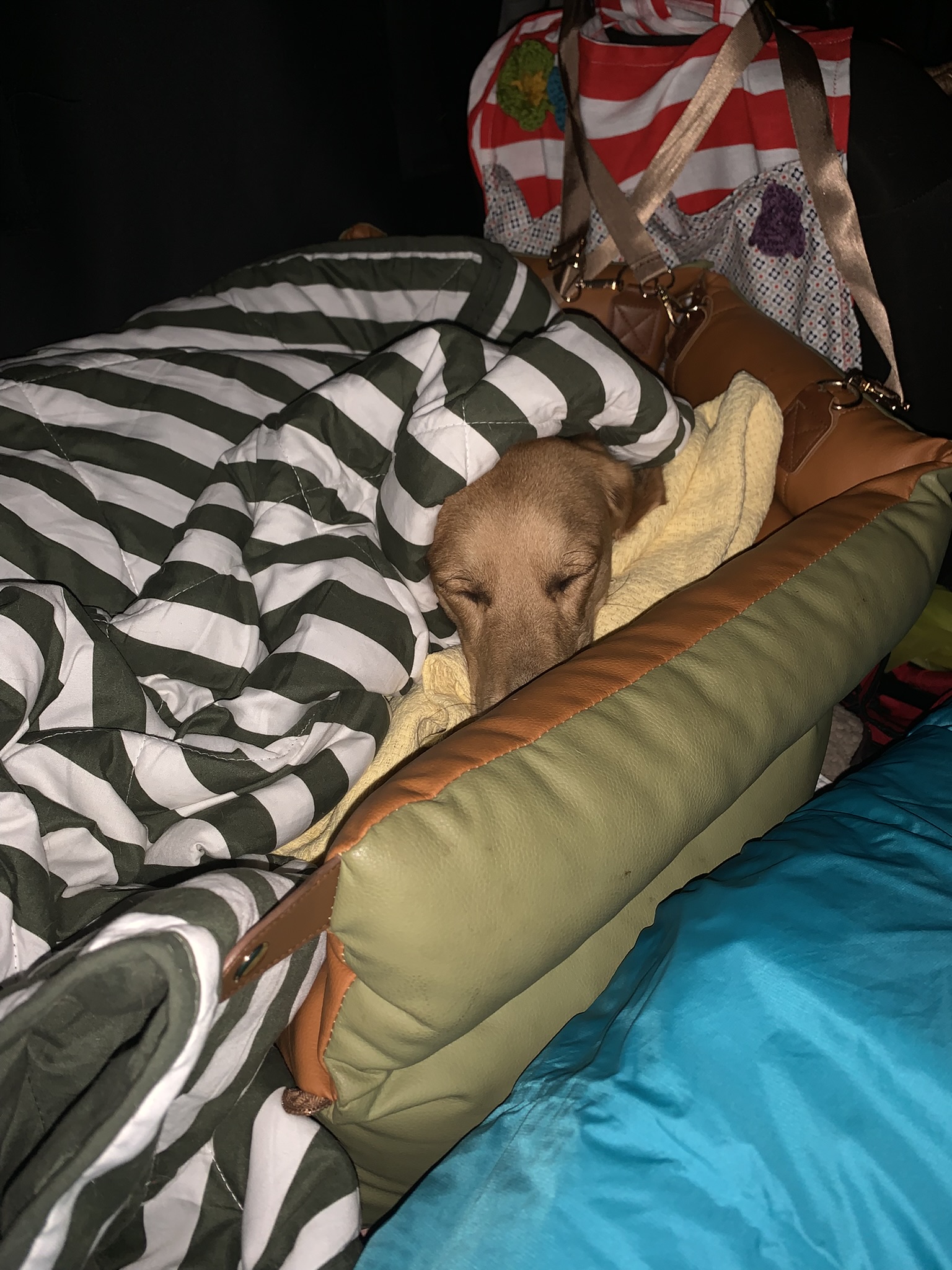 Hier ist die Erste. Mein kleines Auto hat ja nun TÜV bekommen, nachdem wir den Beifahrersitz schnell wieder eingebaut hatten. Jetzt ist er wieder draußen und Selma ist wieder mein Miniunterwegszuhause. Es macht mir ja unglaubliche Freude, alle Dinge und Abläufe so zu optimieren, damit Essen, Waschen, Kacken, Schlafen, Chillen so entspannt wie möglich im Auto ablaufen kann. Jetzt zum Eigentlichen. Ich möchte herausfinden, bei welchen Temperaturen ich es nicht mehr lustig finde, im Auto zu schlafen. Bis jetzt hatten wir ja so 7-8 Grad in der Nacht. Ich habe mit meinem superteuren „Schlaf-doch-mal-im-Himalaya-Gebirge“ -Schlafsack nichts auszustehen gehabt und auch Theo war soweit warm in seinem Bettchen. Wenn es aber noch kälter wird, dachte ich mir, dass er frieren wird. Jetzt gibt es tatsächlich Hundeschlafsäcke für unverschämt viel Geld, kommt für mich aber nicht in Frage. Ein Freund hatte eine gute Idee und meinte, ich solle mal bei Kleinanzeigen nach Kinderschlafsäcken gucken. Lief Bombe.